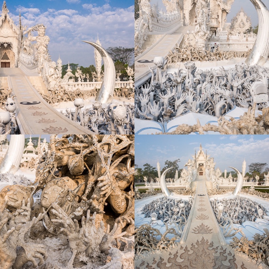 These are close up pictures showing the different aesthetics, symbols and creatures that are found all around this sacred building. This is to transmit a message. We see many heads and hands that are reaching out, showing people escaping from the negativity, the desire and all the greed, raising to grasp on the enlightenment that this religion teaches you. I find it super beautiful that we’ve these places where anyone can go in, find their peace, find forgiveness and hope. I can’t even imagine the feeling, of being able to walk on this beautiful pathway, the two horns, one on each side, emphasising this grand entrance, it must be a great experience.